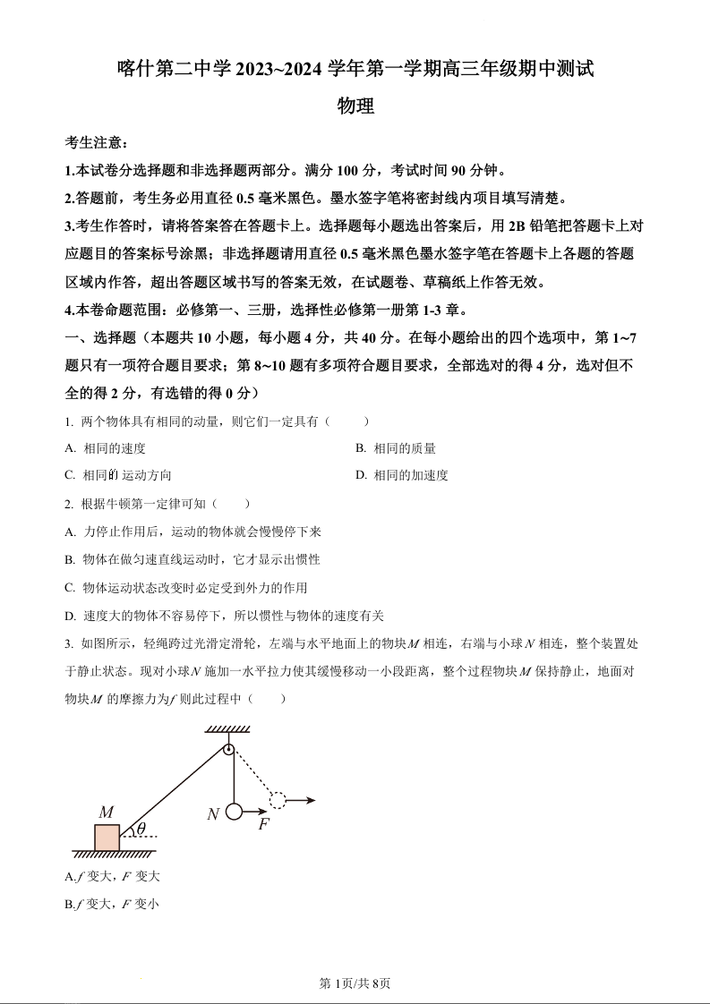 新疆喀什第二中学2024届高三年级上学期期中测试物理(原卷版)