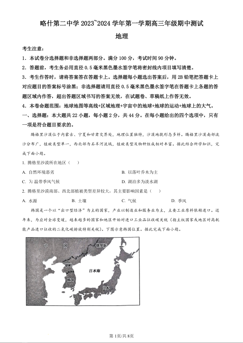 新疆喀什第二中学2024届高三年级上学期期中测试地理(原卷版)