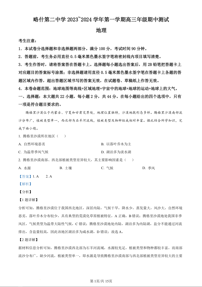 新疆喀什第二中学2024届高三年级上学期期中测试地理(解析版)