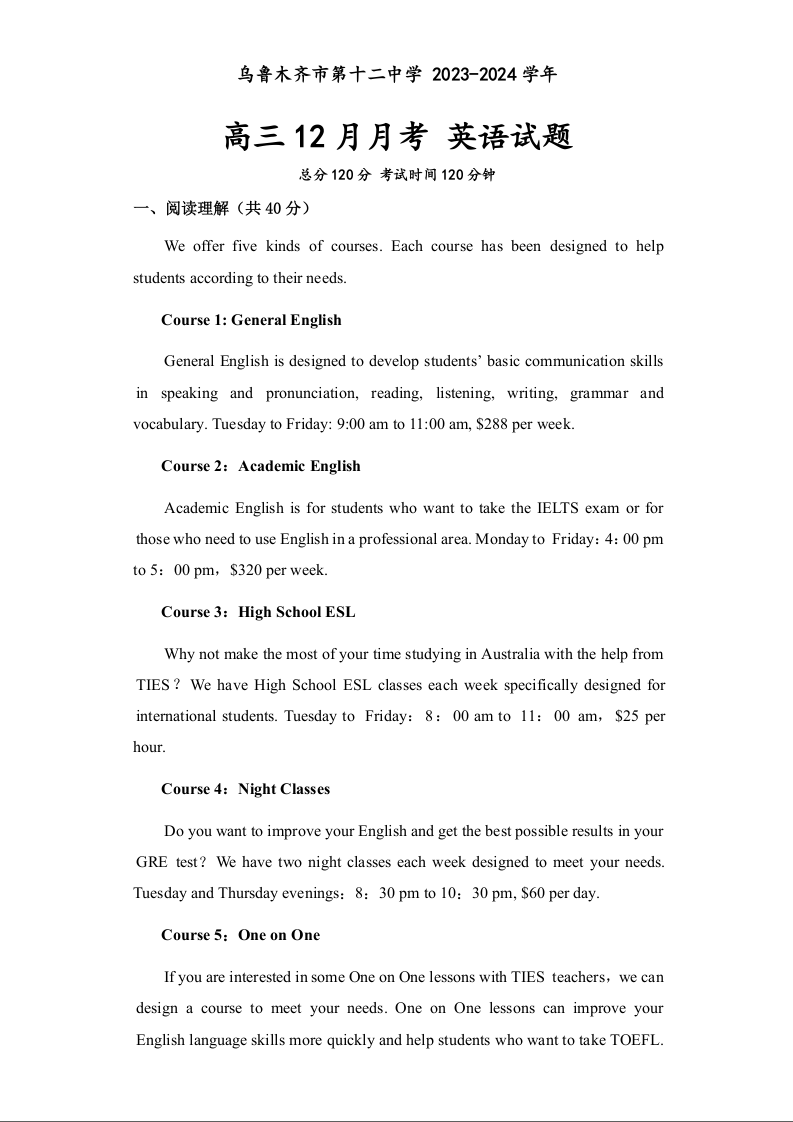 新疆乌鲁木齐市第十二中学2024届高三上学期12月月考英语+答案