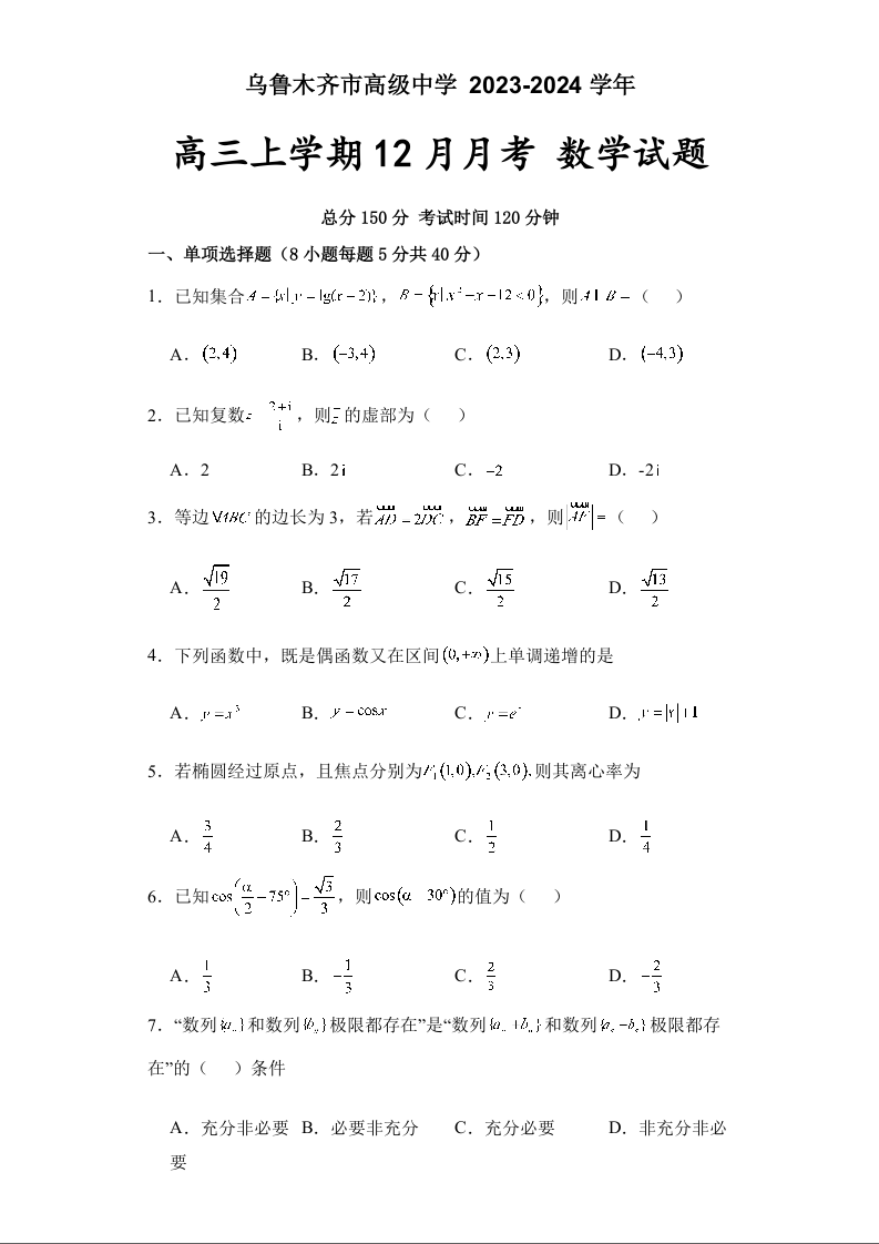 新疆乌鲁木齐市高级中学2024届高三上学期12月月考数学+答案