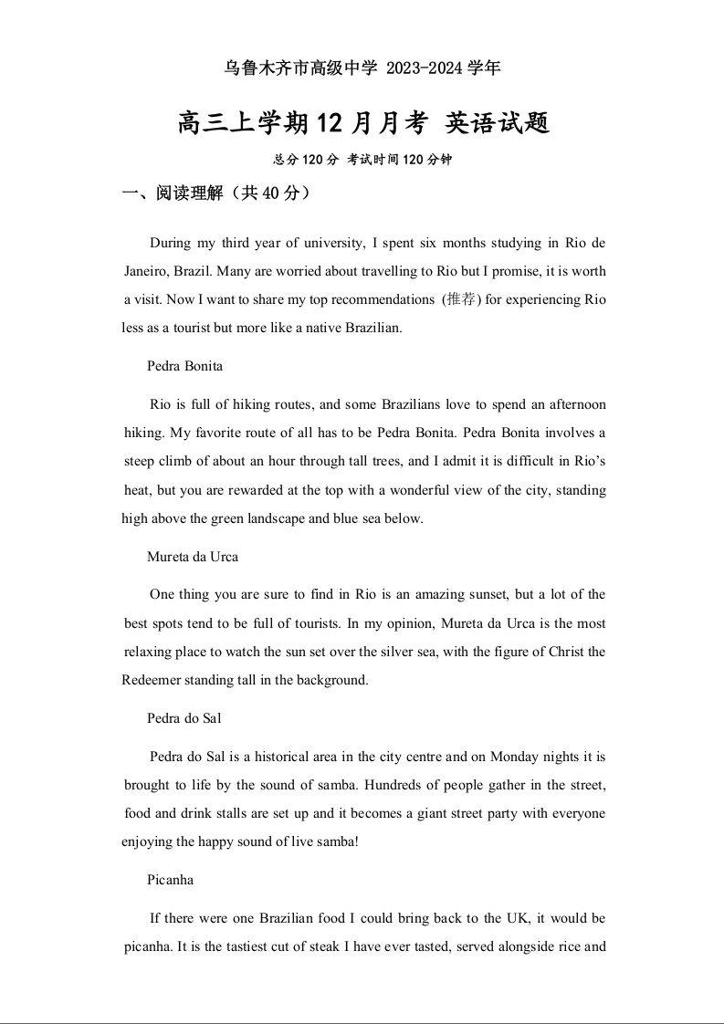 新疆乌鲁木齐市高级中学2024届高三上学期12月月考英语+答案
