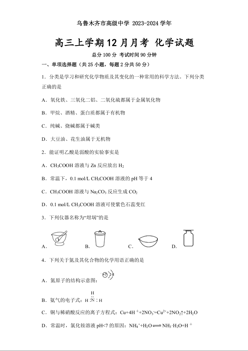 新疆乌鲁木齐市高级中学2024届高三上学期12月月考化学+答案