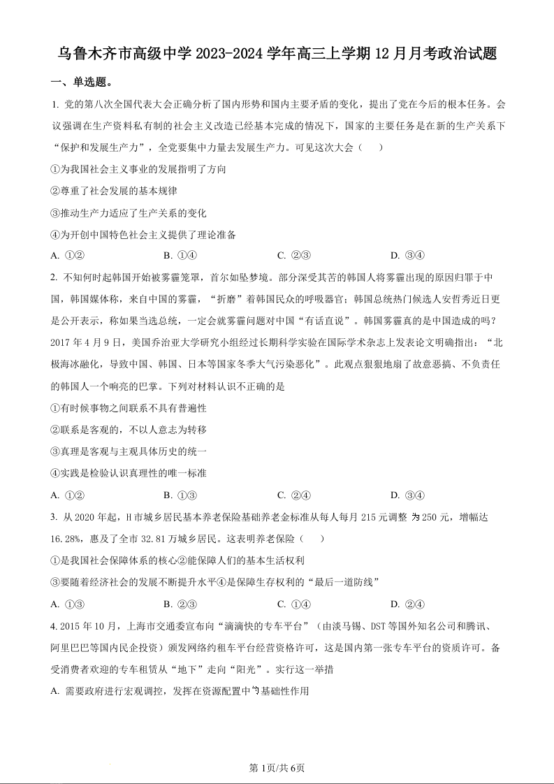 新疆乌鲁木齐市高级中学2024届高三上学期12月月考政治(原卷版)