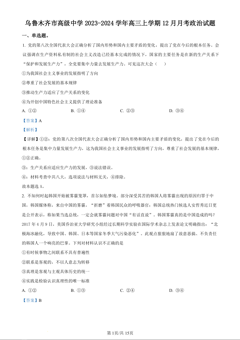 新疆乌鲁木齐市高级中学2024届高三上学期12月月考政治(解析版)