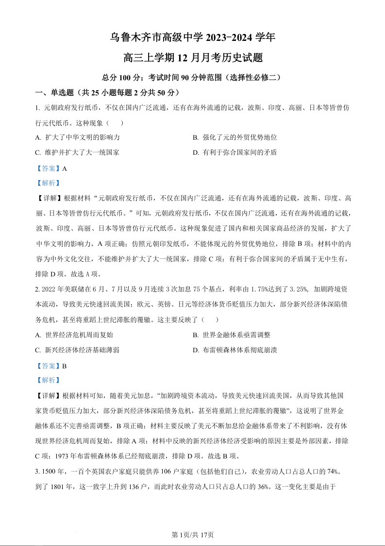 新疆乌鲁木齐市高级中学2024届高三上学期12月月考历史(解析版)