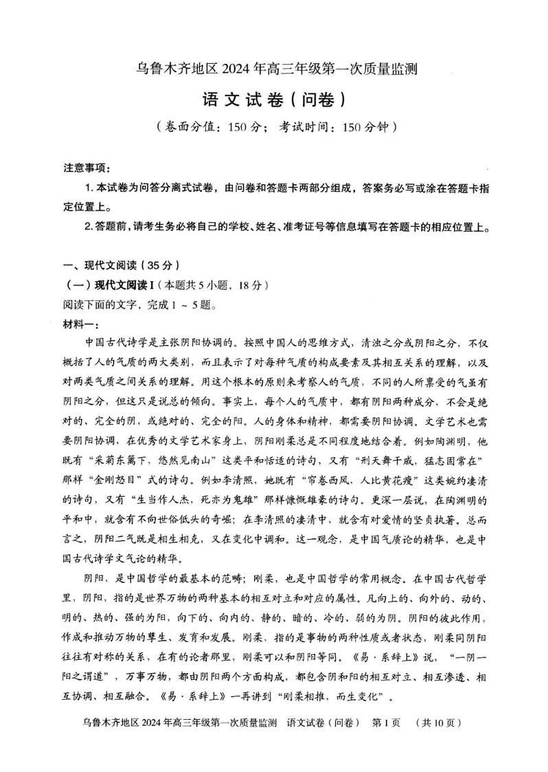 新疆乌鲁木齐市2024届高三上学期第一次质量监测语文