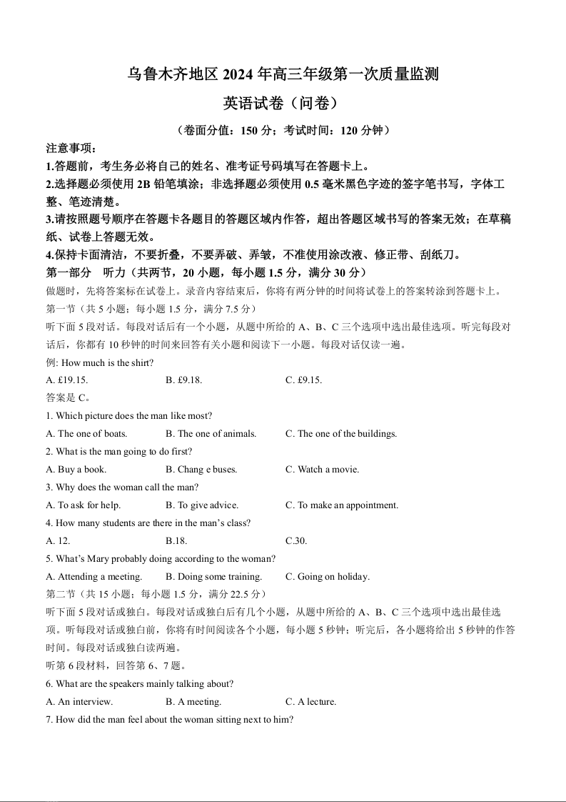 新疆乌鲁木齐市2024届高三上学期第一次质量监测英语