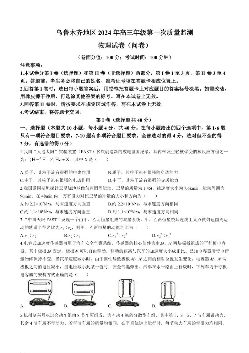 新疆乌鲁木齐市2024届高三上学期第一次质量监测物理+答案