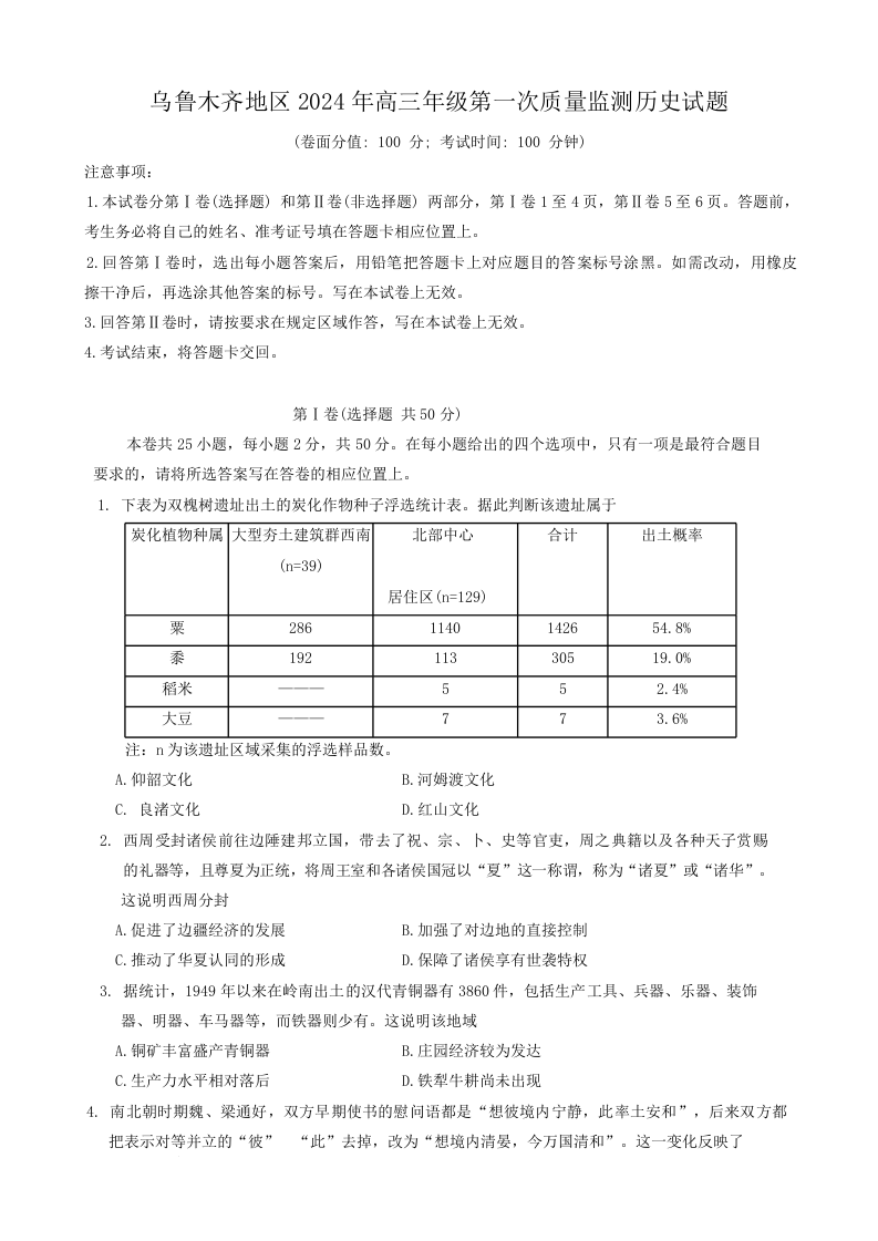 新疆乌鲁木齐市2024届高三上学期第一次质量监测历史