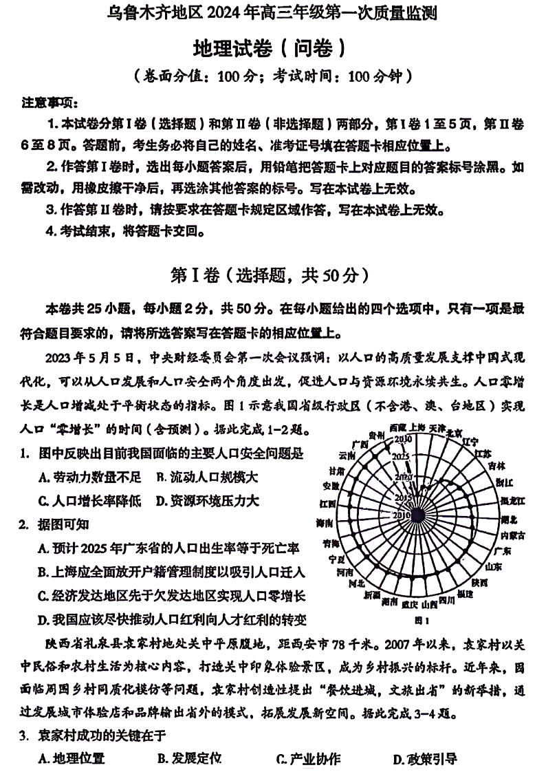 新疆乌鲁木齐市2024届高三上学期第一次质量监测地理