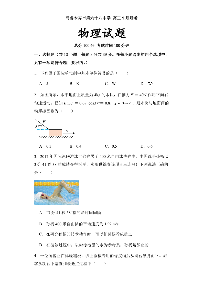 新疆乌鲁木齐市第六十八中学2024届高三上学期1月月考物理+答案
