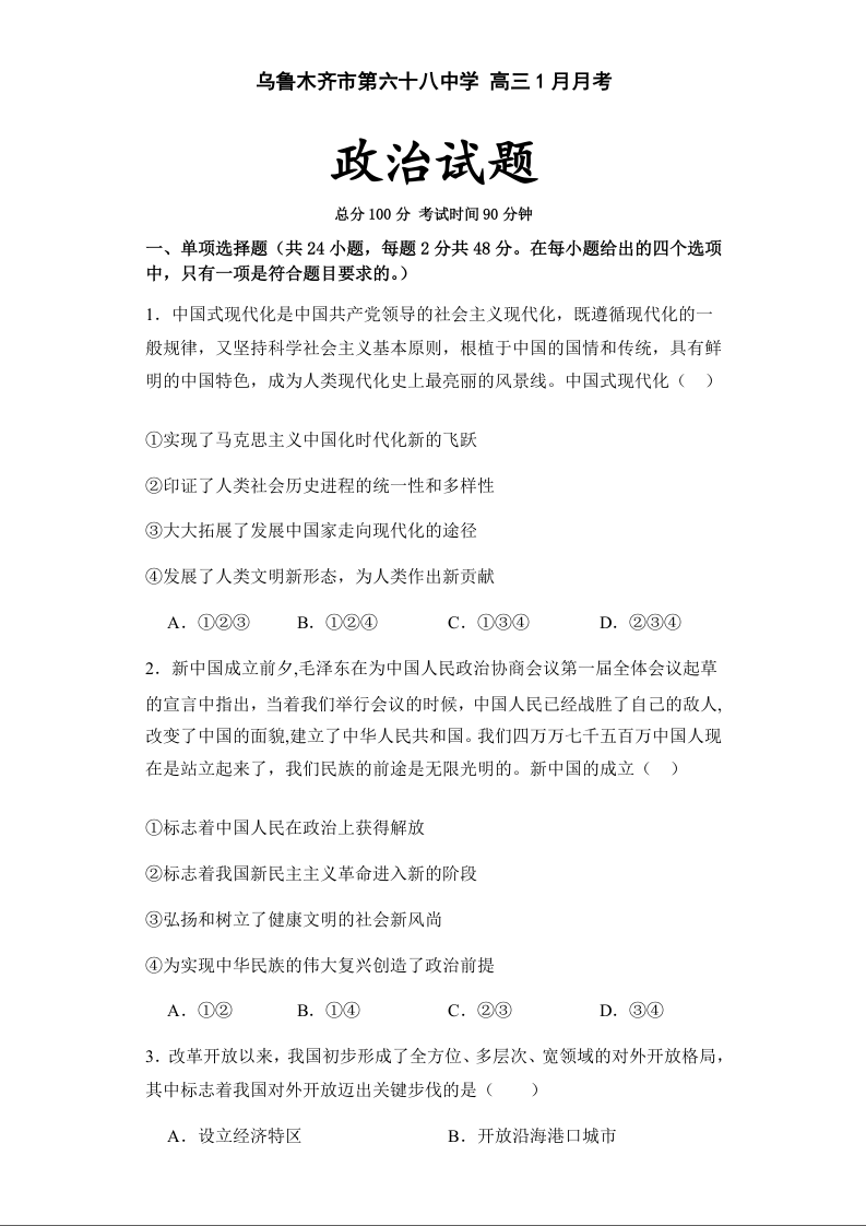 新疆乌鲁木齐市第六十八中学2024届高三上学期1月月考政治+答案