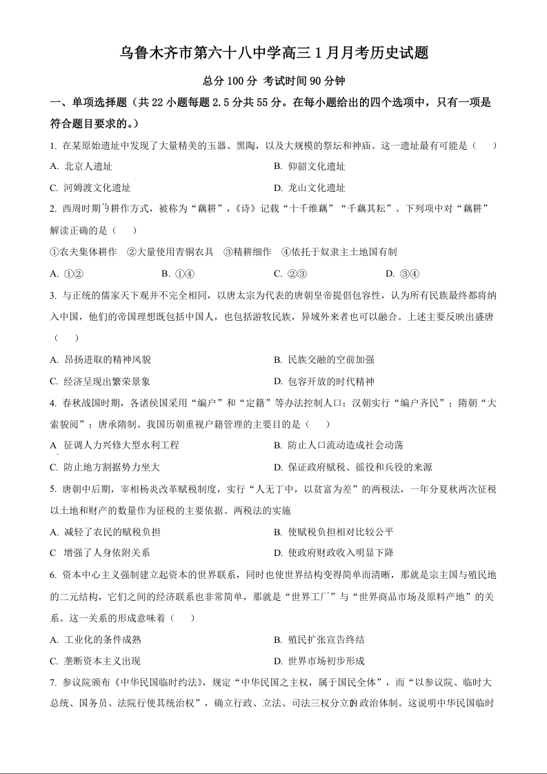 新疆乌鲁木齐市第六十八中学2024届高三上学期1月月考历史+答案