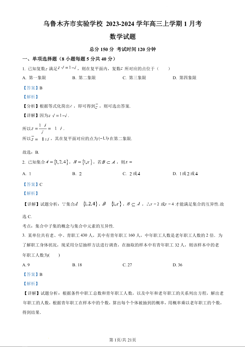 新疆乌鲁木齐市实验学校2024届高三上学期1月月考数学(解析版)