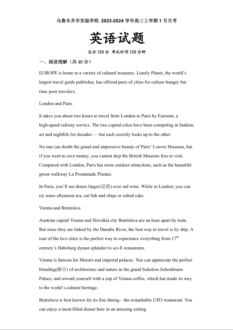 新疆维吾尔自治区乌鲁木齐市实验学校2024届高三上学期1月月考英语+答案