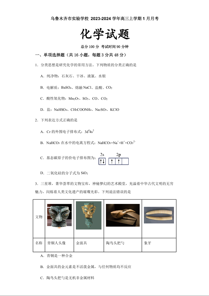 新疆维吾尔自治区乌鲁木齐市实验学校2024届高三上学期1月月考化学+答案