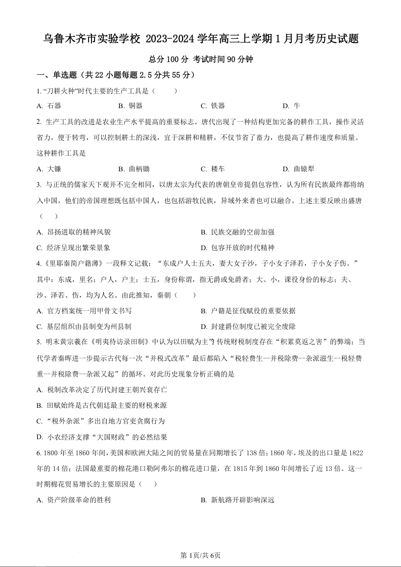 新疆乌鲁木齐市实验学校2024届高三上学期1月月考历史(原卷版)