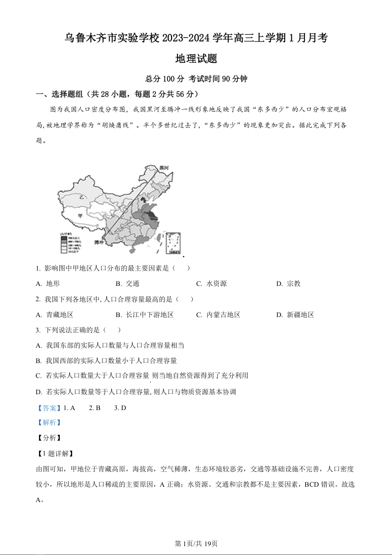 新疆乌鲁木齐市实验学校2024届高三上学期1月月考地理(解析版)