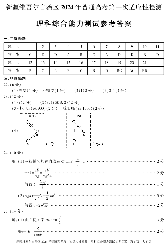 新疆区域高中2024届高三下学期第一次适应性检测理综答案