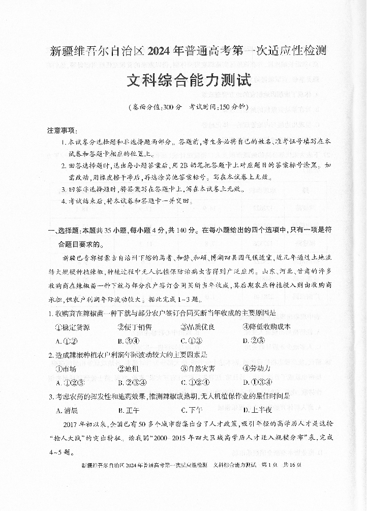 新疆区域高中2024届高三下学期第一次适应性检测文综