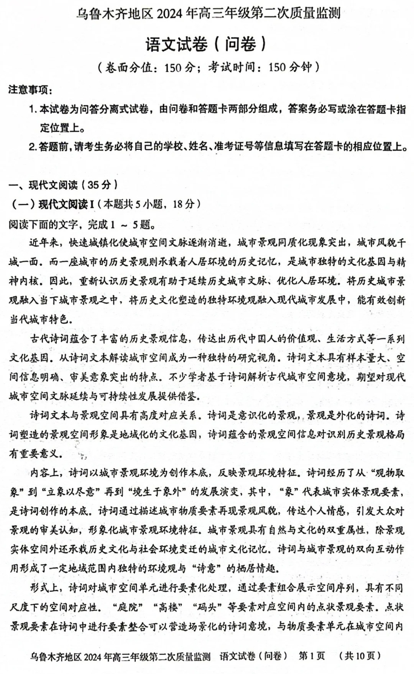 新疆乌鲁木齐地区高三下学期第二次质量监测(新疆二模)语文