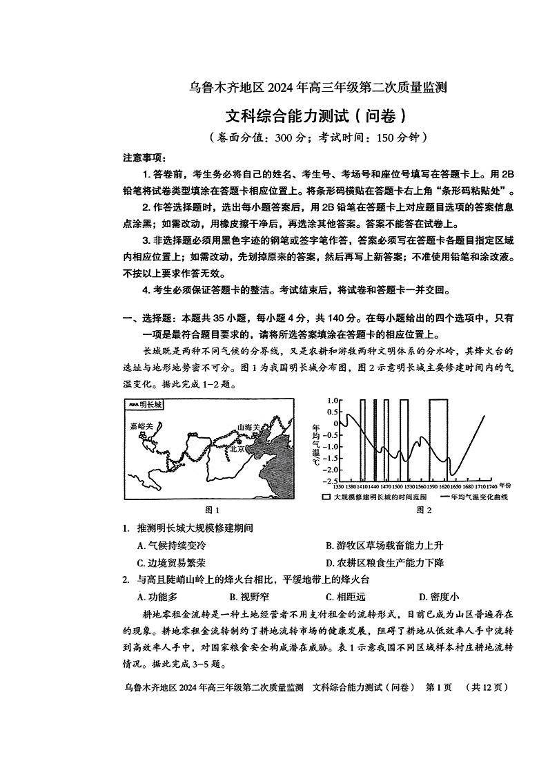 新疆乌鲁木齐地区高三下学期第二次质量监测(新疆二模)文综