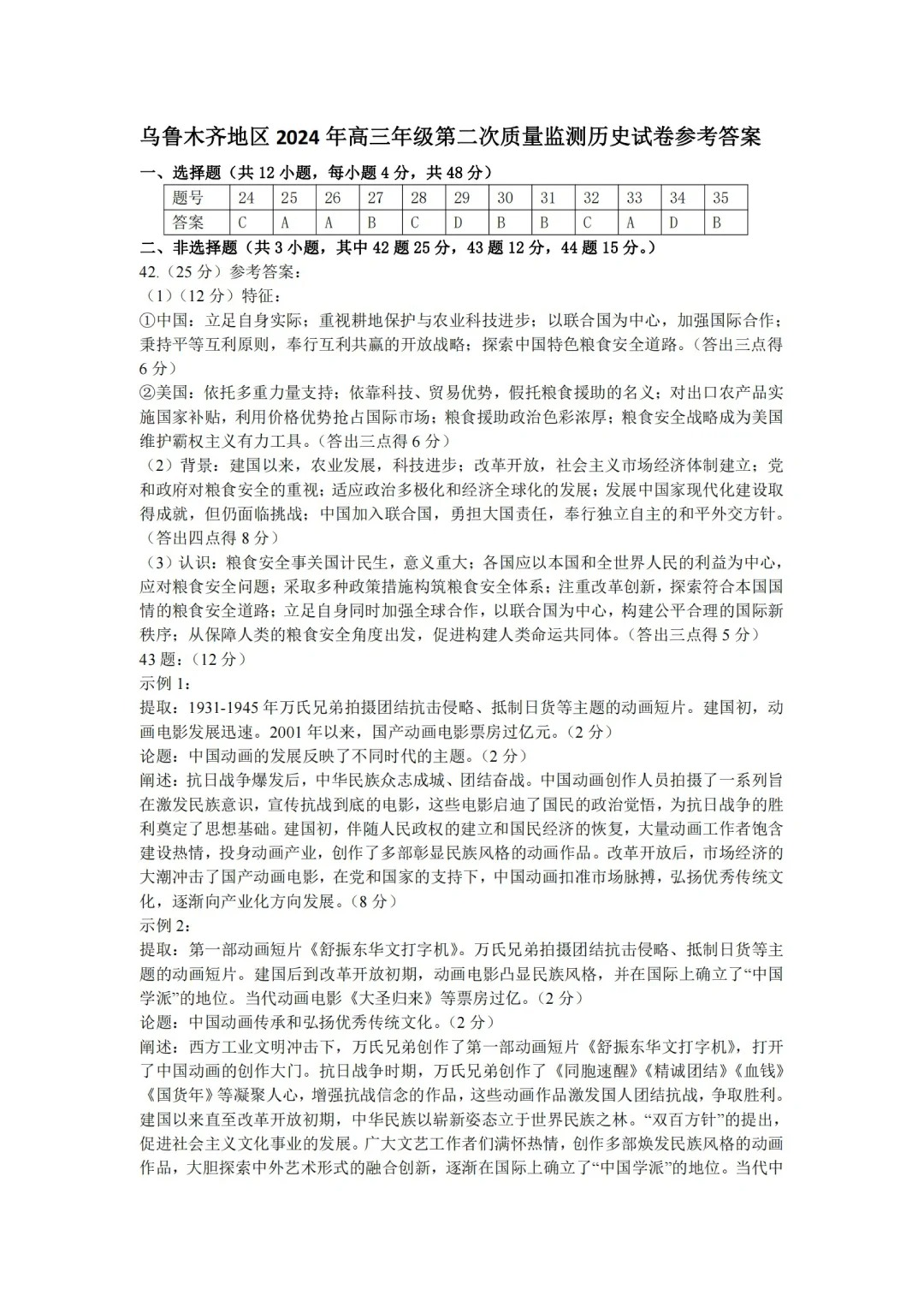 新疆乌鲁木齐地区高三下学期第二次质量监测(新疆二模)历史答案