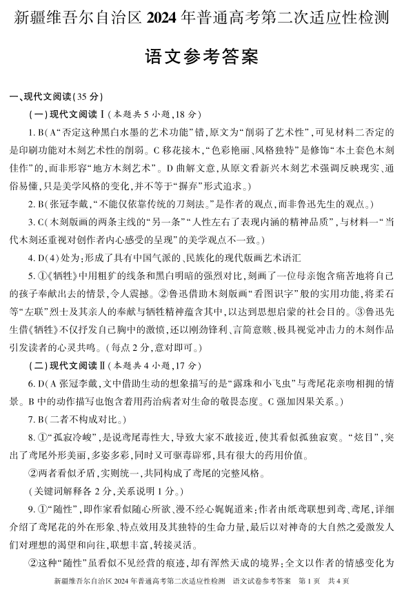 新疆区域高中2024届高三第二次适应性检测(新疆二模)语文答案