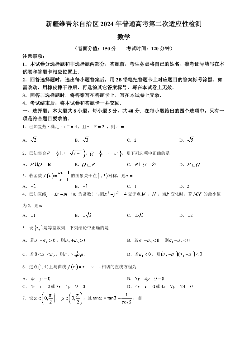 新疆区域高中2024届高三第二次适应性检测(新疆二模)数学+答案