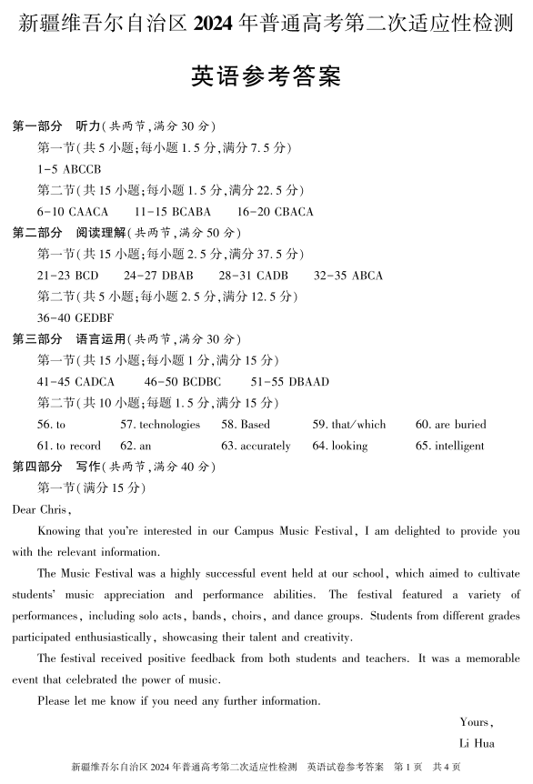 新疆区域高中2024届高三第二次适应性检测(新疆二模)英语答案