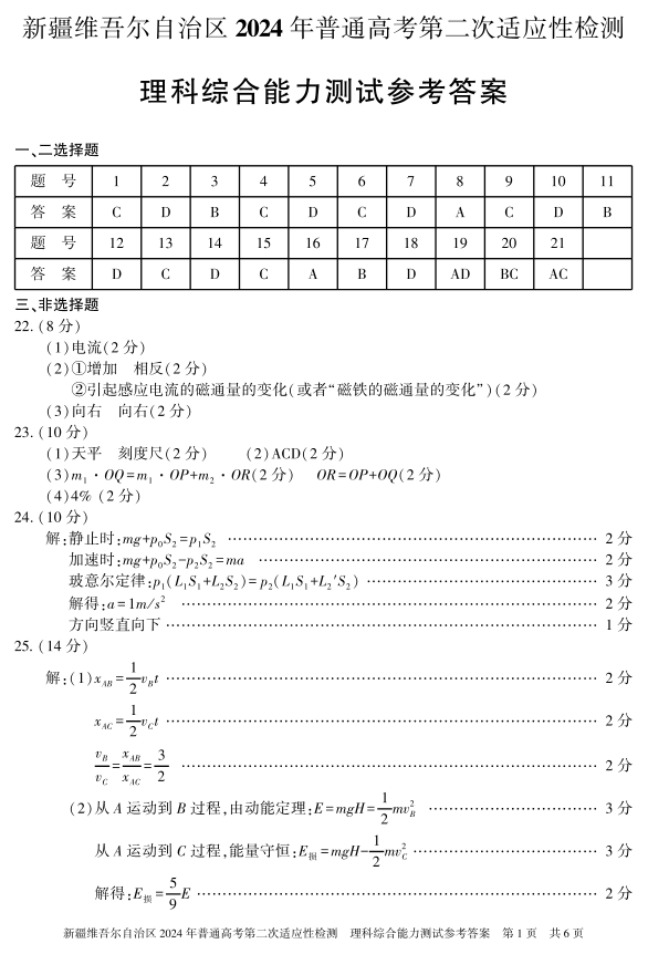新疆区域高中2024届高三第二次适应性检测(新疆二模)理综答案