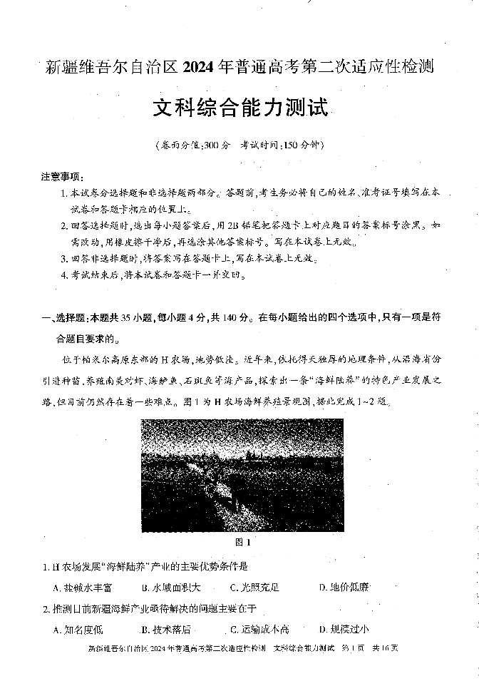 新疆区域高中2024届高三第二次适应性检测(新疆二模)文综