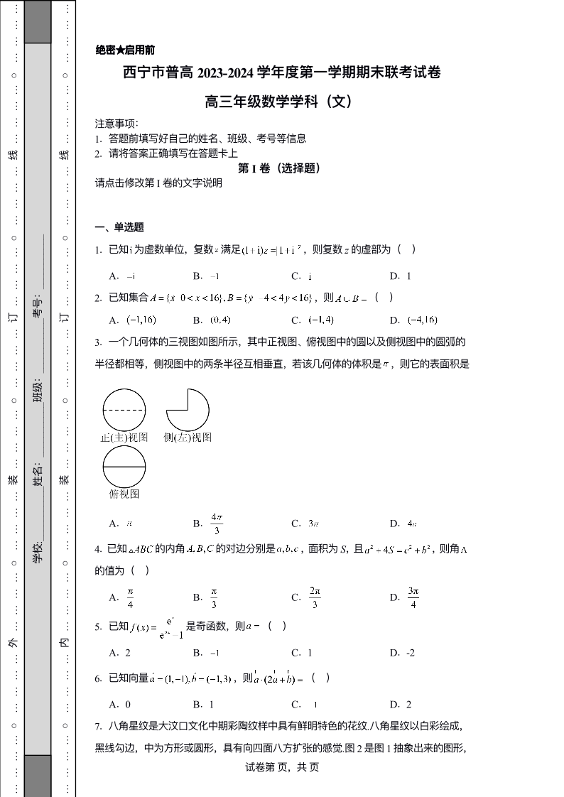 青海省西宁市2024届高三上学期期末联考文科数学答案