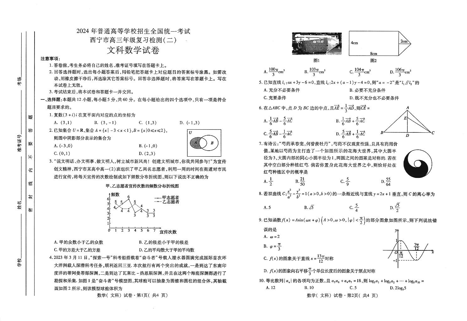 青海省西宁市2024届高三下学期二模文科数学+答案