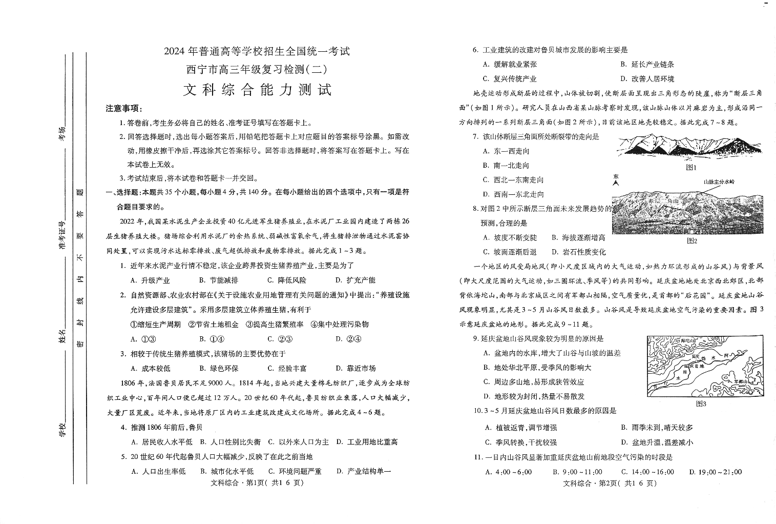 青海省西宁市2024届高三下学期二模文综+答案