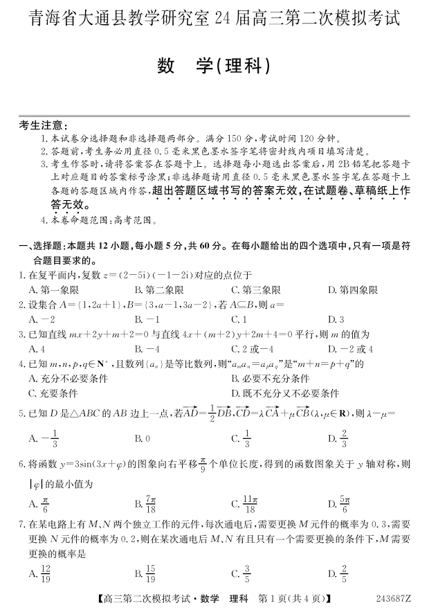 青海省西宁市大通县2024届高三第二次模拟考试理数