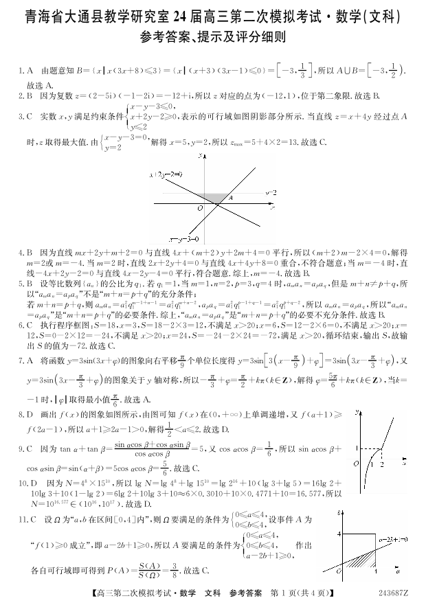 青海省西宁市大通县2024届高三第二次模拟考试文数答案