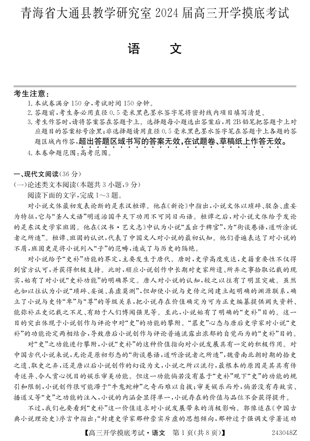 青海省西宁市大通县2024届高三上学期开学摸底考试语文