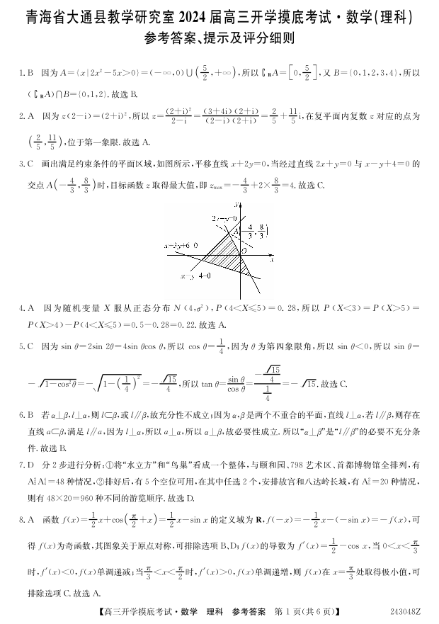 青海省西宁市大通县2024届高三上学期开学摸底考试理数答案