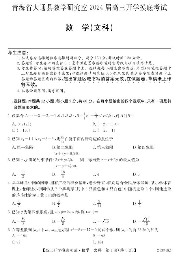 青海省西宁市大通县2024届高三上学期开学摸底考试文数