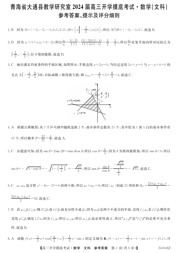 青海省西宁市大通县2024届高三上学期开学摸底考试文数答案