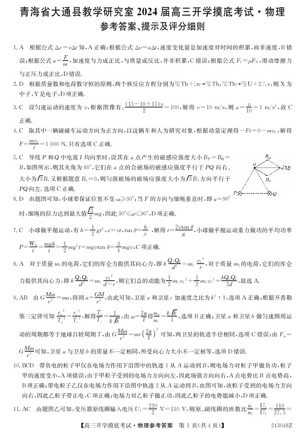 青海省西宁市大通县2024届高三上学期开学摸底考试物理答案