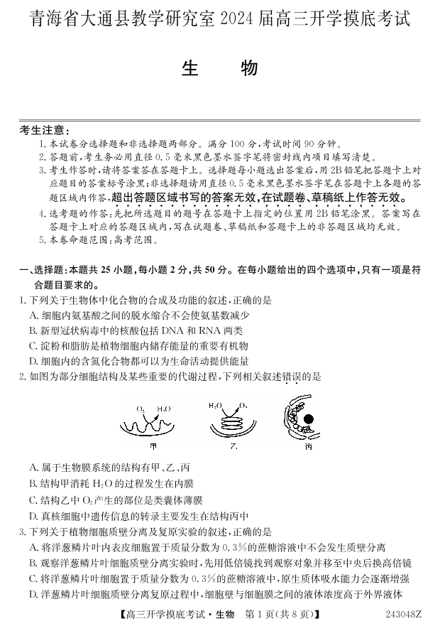 青海省西宁市大通县2024届高三上学期开学摸底考试生物