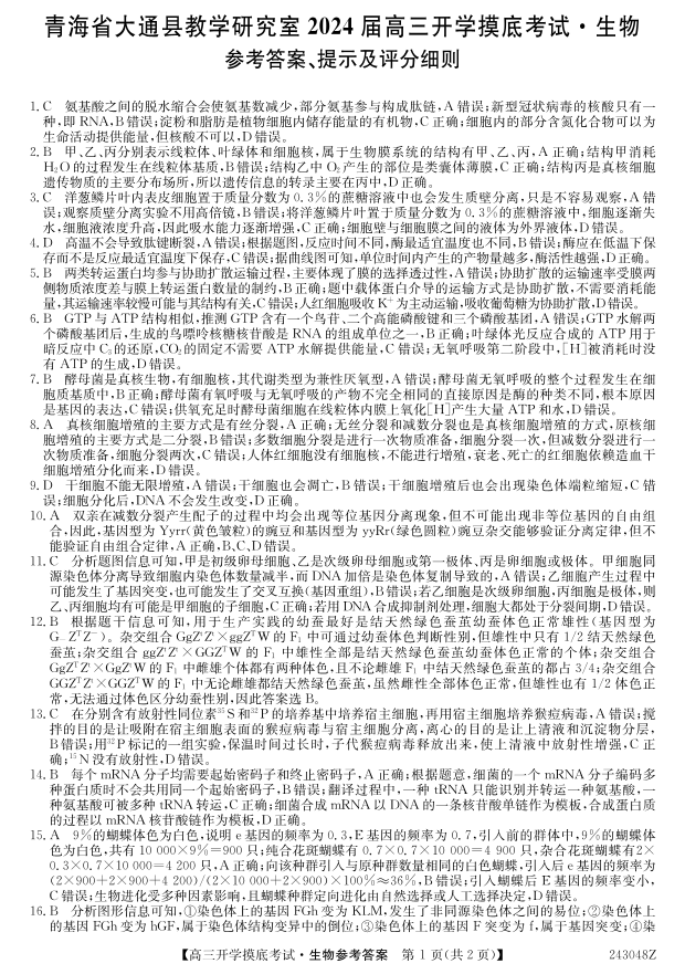 青海省西宁市大通县2024届高三上学期开学摸底考试生物答案