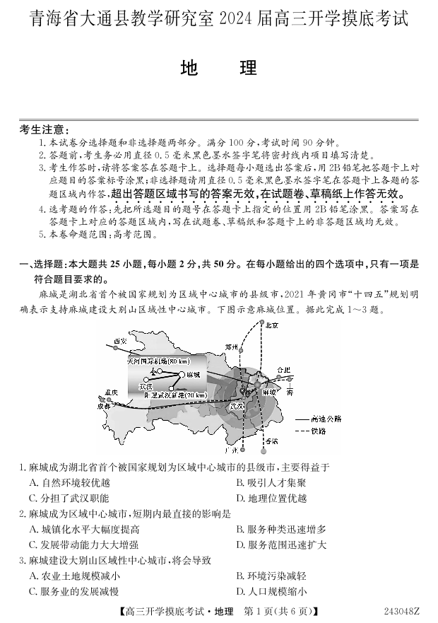 青海省西宁市大通县2024届高三上学期开学摸底考试地理