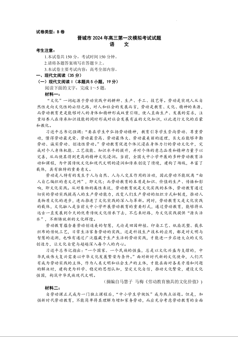 山西省晋城市2024届高三上学期第一次模拟考试(296C)语文+答案