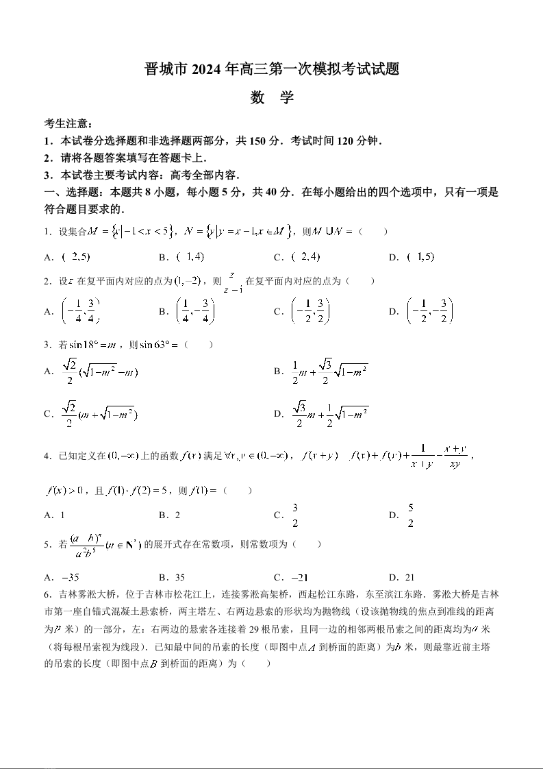 山西省晋城市2024届高三上学期第一次模拟考试(296C)数学+答案