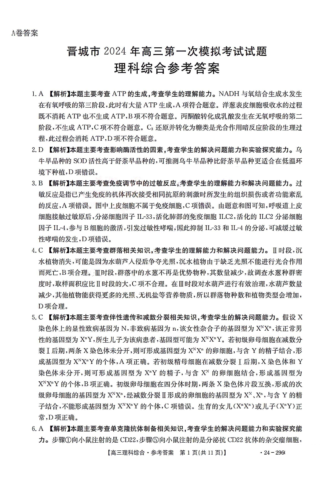 山西省晋城市2024届高三上学期第一次模拟考试(296C)理综答案
