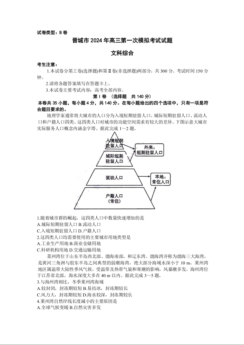 山西省晋城市2024届高三上学期第一次模拟考试(296C)文综+答案